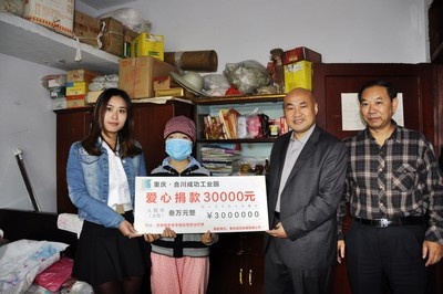李祖怡今年13歲,父母雙雙下崗,染病后巨額的醫療費用讓原本貧困的家庭瀕臨絕境。今年10月中旬,成功公司得知此消息后,馬上慷慨解囊,在合川區民間慈善團體——愛(ài)心黃桷樹(shù)及合川區慈善總會(huì )的協(xié)助下,捐助一部分醫療費用幫助李祖怡早日戰勝病魔。當成功公司及合川慈善組織人員走進(jìn)簡(jiǎn)陋的出租房,把捐助款送到李祖怡家人手上時(shí),一家人連聲謝謝,幾度哽咽。
